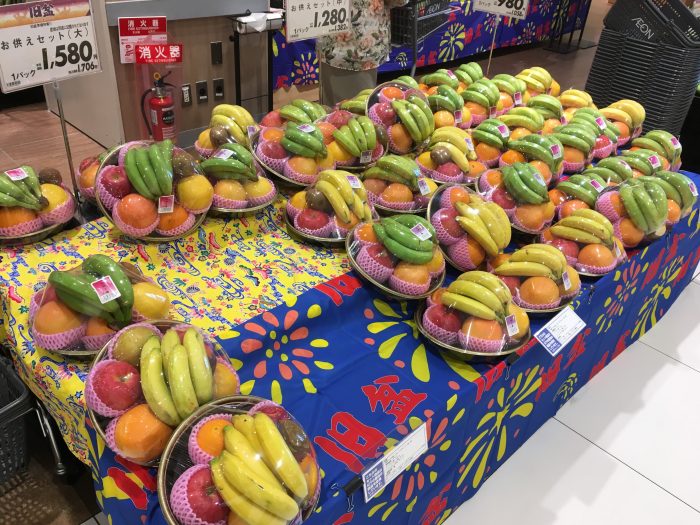 この時期に沖縄のスーパーでは沖縄の旧盆の準備の商品がたくさんあります。